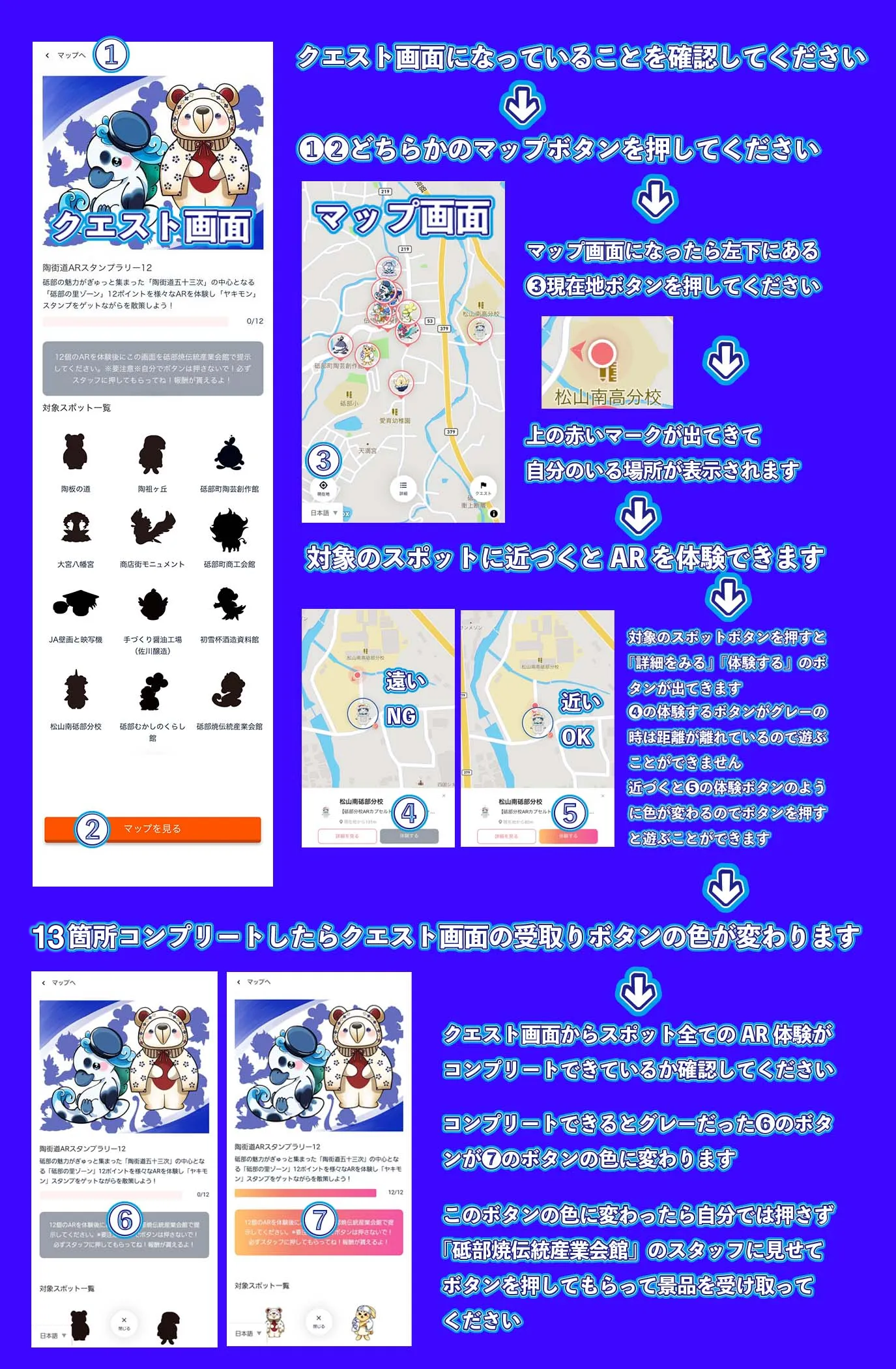 各スポットのARを体験するとスタンプが押されて、13個たまると「砥部焼伝統産業会館」で景品をゲットすることができます。